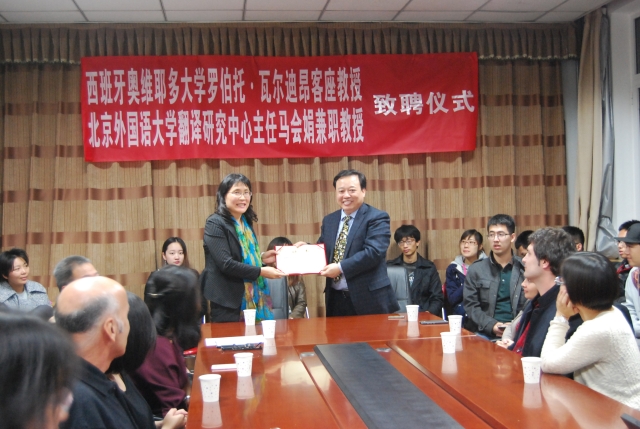 10月21日下午,禁漫天堂 139会议室隆重举行了北京外国语大学马会娟教授受聘为兼职教授的致聘仪式。仪式由院长助理马红旗教授主持。西班牙奥维耶多大学罗伯托·瓦尔迪昂教授、学院院长、博士生导师阎国栋教授及翻译学研究中心主任、博士生导师苗菊教授出席。西班牙语专业3名外籍教师及全体师生、禁漫天堂 硕博生参加了本次仪式。