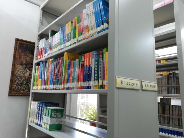 外院网站讯(通讯员 王喆)为方便我院师生借阅图书,在学院领导的支持下,资料中心购置安装新书书架,将1000余册新书分类放置,特设新书(综合)书架,新书(意大利语)书架,新书(葡萄牙语)架,新书(西班牙语)书架,新书(德语)书架。图书导引标识粘贴在书架侧方,能够让前来借阅图书的师生对图书放置一目了然。