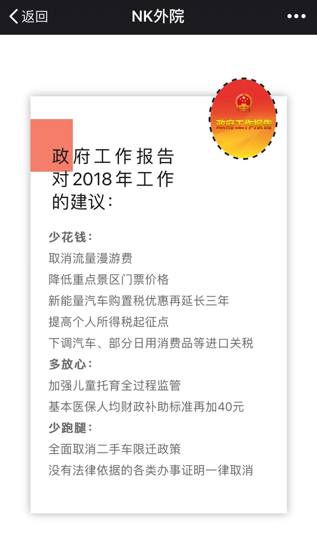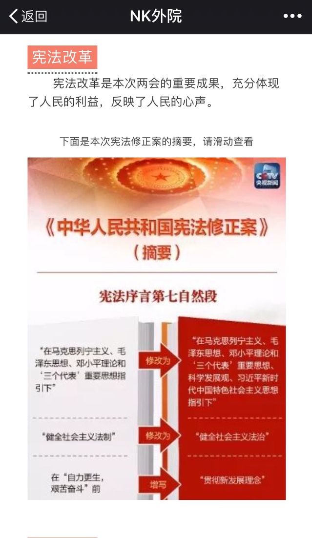 3月21日两会结束后的第一天,“NK外院”微信公众号即推出《这些声音你听到了吗》两会专题推送,此文案的筹划由学院团委宣传部下设理论研修中心全力打造,两会前便积极部署,会议期间团队成员密切跟进会议动态,实时捕捉贴心大学生成长成才的关键内容成为推送素材。整体文案内容制作精良,在推出两小时内即达到了600+的阅读量。
