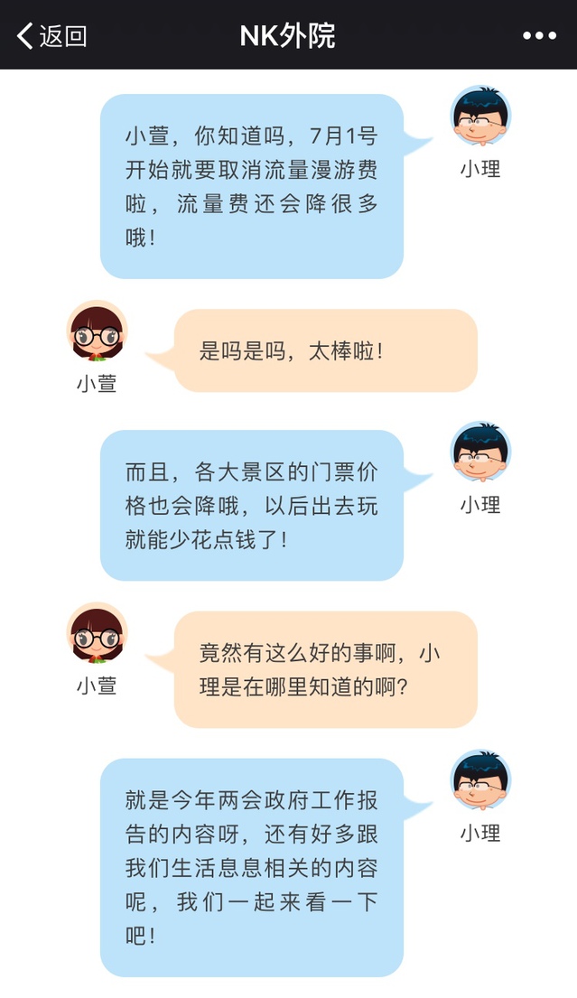 整篇推送摆脱了制作简单、强行拼凑的状态,而是精心谋篇布局,合理规划文章结构,融合了更多的交互元素,创意性、趣味性以及合理性都大幅提升。开篇标注文章字数、阅读所需时间,细节处彰显推文精致度;从取消流量漫游费入手,利用虚拟对话形式引发读者关注兴趣;利用“滑动查看”新技能,在保证内容质量的同时尽量缩短篇幅,减轻阅读者视觉疲劳。遵循新媒体规律,将推送定位于“听”见两会,文案取名为《这些声音你听到了吗》,更加引人入胜。