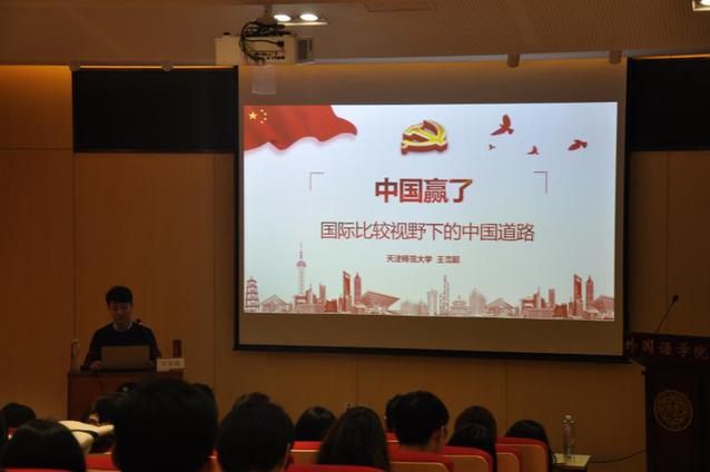 王雪超新颖的设计角度、富含理论深度、充满感染力的讲授同时又符合时代潮流的语言讲座伊始便吸引了在座所有人。他以2017年11月13日发售的《时代》周刊上的大标题“中国赢了”开篇,着重阐释国际比较视野下的中国道路,不论是历史层面还是人民层面,指出坚定不移地走中国道路都是必然选择。