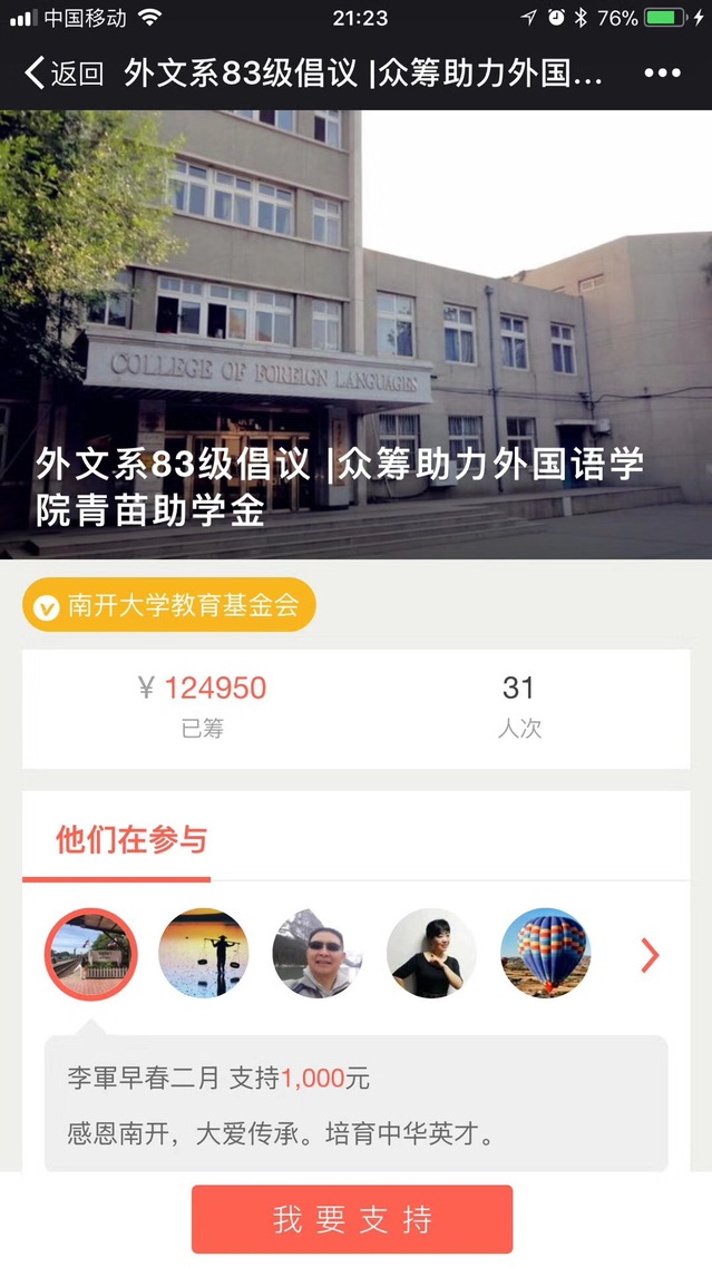 谈及助学金的命名,捐助校友们表示,外院83级校友在南开园学习生活时也曾如同“青苗”,如今已然在祖国的大江南北扎根,成长为一棵棵郁郁葱葱的大树,却始终没有忘记学校和学院的培育。校友们希望以自身的绵薄之力,为母校留下些积极向上、相互关爱且薪火相传的物质或精神,为如今青葱的“幼苗”洒下一片阳光,让他们能够茁壮成长,长大后继续传递这种大爱。