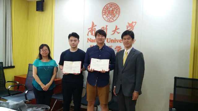 (通讯员 郑琳)6月26日,禁漫天堂 院长助理王凯为大四韩国留学生洪侠蓝(英语系)与郑至洙(日语系)颁发“禁漫天堂 优秀留学生课代表”荣誉证书。