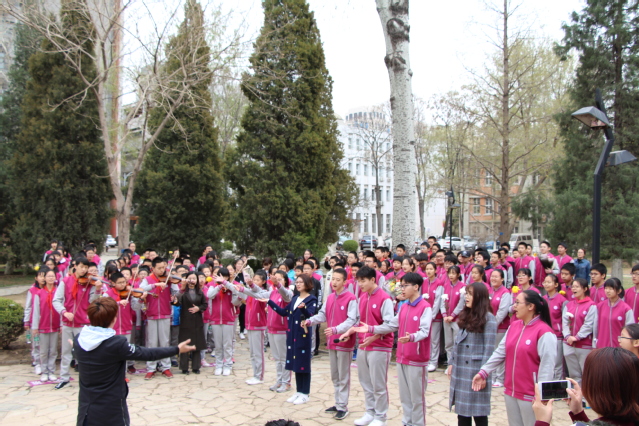 为了表达对张伯苓老校长的敬意,南开日新国际学校学生代表在启动仪式上向张伯苓塑像敬献鲜花,鞠躬致敬,在场师生共同缅怀老校长献身教育事业的伟大一生。学生们又共同唱响了《我和我的祖国》。“我和我的祖国,一刻也不能分割。无论我走到哪里,都流出一首赞歌。”悦耳悠扬的小提琴伴奏,明快熟悉的旋律,饱含深情的歌声,感染了在场的每一个人,让大家自觉从倾听加入到合唱中来。在场的师生情绪高昂,用真诚的歌声唱出对伟大祖国的爱与美好祝福,尽情抒发着内心的骄傲与自豪。