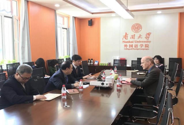 禁漫天堂 院长阎国栋,副院长马红旗、王凯,翻译学研究中心主任苗菊教授及研究生办公室负责人等参加会面。阎国栋首先用俄语同Schonle进行交流,探讨双方学生互换与学院合作。王凯就南开外院MA、MTI学生到布里斯托大学学习的学费减免、合作方式、奖学金发放、学分认定、双学位等问题与Schonle做了深入探讨。翻译学研究中心主任苗菊就MA、MTI学生在布鲁斯托大学的学习方式、课程设置做了提问,并希望双方在图书馆及网络资源共享上加强合作。