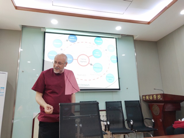 皮内罗博士通过有趣易懂的方式为同学们介绍了意大利语中的一些词法句法,讲座过程中他与同学们进行了充分的互动,寓教于乐,整场讲座氛围轻松愉快。两场讲座既使同学们对平时从书本上习得的知识有了更鲜活深入的认识,也为老师们的教学方法带来启发。