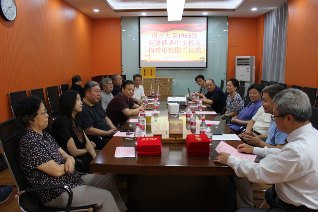 1965级英语专业周兴俊(线装书局原总经理兼总编辑)、曾尔恕(中国政法大学图书馆原馆长)、李亦雄(沈阳音乐学院教授)、赵丛林(沈阳音乐学院原副院长)、1965级俄语专业谢俊平(中国驻爱沙尼亚共和国原大使)及中文系1965级张圣洁六位老校友,驱车百余里专程赴母校捐赠图书。