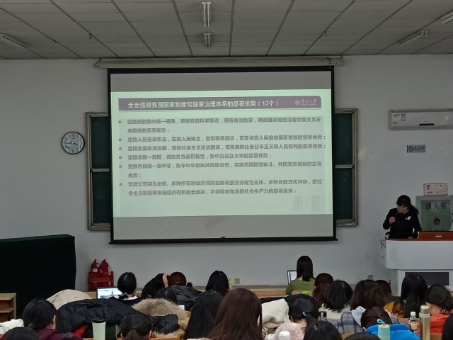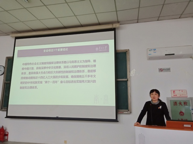 邹玉洁同志嘱托学生党员同志不忘初心、牢记使命,时刻同党中央走在同一条战线上,用党的思想武装自己的头脑。2018级硕士生第二党支部书记王佳慧表示:通过此次主题宣讲,我对党推进各方面制度更加成熟更加定型的时间表和路线图有了更清晰的认识,也对制度建设的重要性有了更深刻了解。作为大学生党员,我们应该认真学习全会精神,坚持制度自信,助力夯实实现中华民族伟大复兴的制度根基。