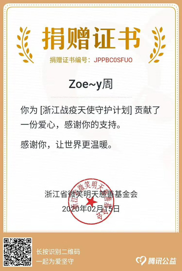 2006级英语周惠光校友为“浙江战疫天使守护计划”捐款献爱心。