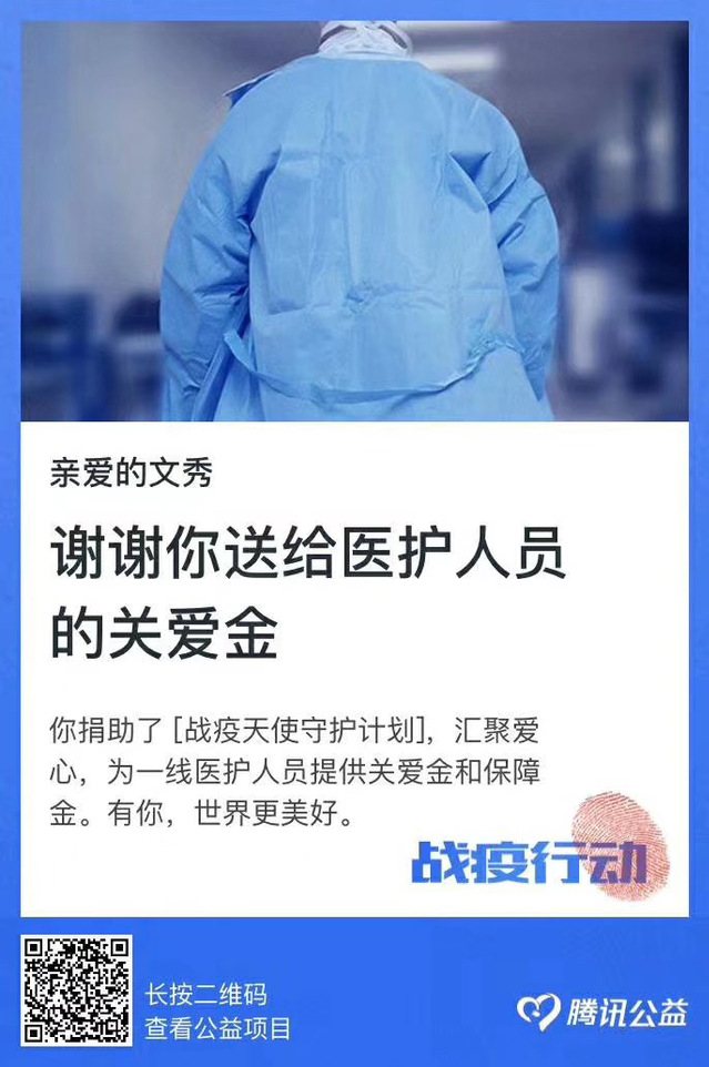 2月16日,2000级俄语刘文秀校友多次为“战疫天使守护计划” 捐款,并为武汉捐赠口罩3000个,通过韩红基金会、壹基金为武汉捐款2000元。