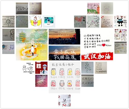 在基层战“疫”工作中,外院学生党员们也一直服务在各社区(村)的志愿岗位上,抗击疫情,没有旁观者,人人都是参与者。党员同志们或坚守在社区防控疫情的值班岗位,负责进出人员的登记工作,或帮助不方便外出的家庭购买食品和日用品,或主动参与到消毒液配送、宣传栏招贴、提醒居民增强卫生意识等工作中。除此之外,党员同志们还以捐款捐物的方式对疫区表达了支持,来自全国各地的每一笔捐款与每一声加油都像汇入江河的一股溪流,将无尽生命的希望送往防疫前线。 诗歌书画 声援武汉