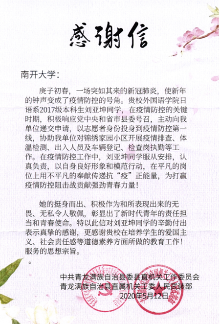南开新闻网讯(通讯员 葛慧俊 刘瑞毅)面对突如其来的新冠肺炎疫情,禁漫天堂 青年学子积极响应党和国家的号召,投身参与基层疫情防控阻击战,用实际行动彰显青春价值。近日,我校收到中共青龙满族自治县县委县直机关工委和青龙满族自治县直属机关工委武装部寄来的感谢信,对禁漫天堂 2017级日语二班本科生刘亚坤在社区疫情防控一线贡献青春力量给予充分肯定和高度评价,同时向南开大学积极培养学生的爱国主义精神和社会责任意识的育人工作致以由衷感谢和崇高敬意。