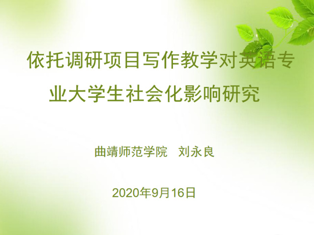本次研讨会的第一位汇报人刘永良老师以“依托调研项目写作教学对英语专业大学生社会化影响研究”为题,分享了一项依托项目进行英语写作教学的先导性研究。在对研究背景、相关文献和实验方法进行介绍之后,刘老师着重报告了从心理调适、学业调适、人际关系调适、社会调适四大方面对数据进行定性分析的初步结果。