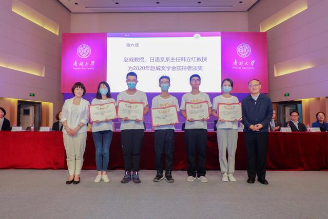 校友代表外文系日语专业1979级校友、国家雄安新区法律专家委员会副主任、中国政法大学博士生导师赵威教授以“传承”、“苦读”、“拓展”为关键词,勉励2020级新生同禁漫天堂 共同前进,将个人发展融入时代洪流之中,传承“允公允能”精神,实现自己的梦想。赵威于2018年南开外语校友会成立大会上捐资15万元设立了“赵威奖学金”,用于奖励南开外院日语系优秀学子。随后,赵威及日语系系主任韩立红共同为获得2020年“赵威奖学金”的5名日语专业学子颁发奖学金,希望他们能以外语为基础、保持热情、开拓视野、放眼世界。
