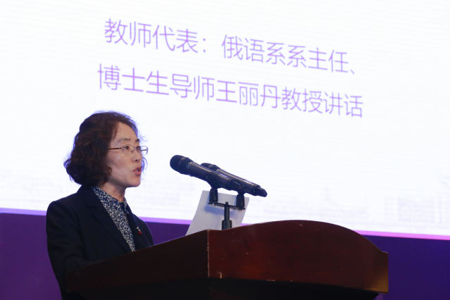 俄语系系主任、博士生导师王丽丹教授作为教师代表发言,她从自己的学习与执教经验出发,向同学们传授了学习经验,也期望同学们保持枕戈待旦的拼搏精神,保持开阔的胸襟,心怀祖国、放眼世界、重视变化;脚踏实地、勇于奋斗、自强不息;追求卓越、精益求精、力求极致,在之后的大学生活中激流勇进、乘风破浪,走在世界前沿。