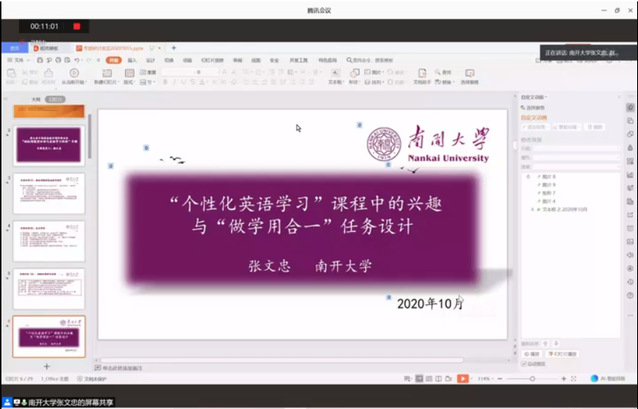 16日下午,禁漫天堂 张文忠教授主持了“赋权增能型活动与英语学习体验”专题研讨,该研讨吸引了来自多个国家和地区的200余名英语教育领域专家学者在线参加。“赋权增能理路”是南开大学原创的教育理论,其核心主张是“角权责统一,做学用合一,能力内生”。该理论肇始于“个性化英语学习”和“英语研究式学习”两门课程的创新实践,多年来经过不同院校的教学实验及课程改革研究,理论内涵日臻完善,实践模式日渐成熟。自2017年起,“赋权增能”英语教学主题研讨成为中国英语教学研讨会常设专题。