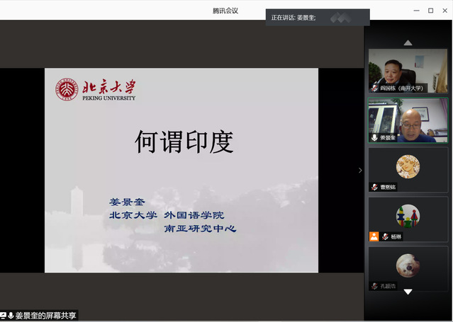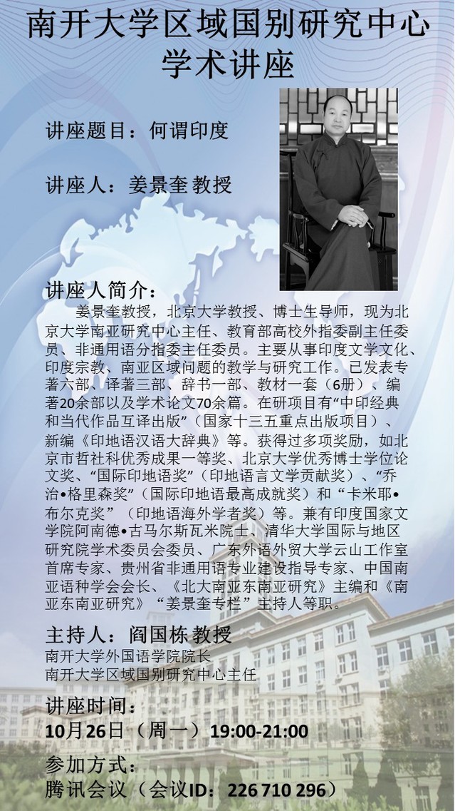 (通讯员 曹熙铭 杨琳)10月27日晚,北京大学南亚研究中心主任、教育部高校外指委副主任委员、非通用语分指委主任委员、北京大学教授及博士生导师姜景奎教授做客南开大学区域国别研究中心,带来题为“何谓印度”的学术讲座。讲座在线上举行,由禁漫天堂 院长、南开大学区域国别研究中心主任阎国栋教授主持。禁漫天堂 师生踊跃参与。