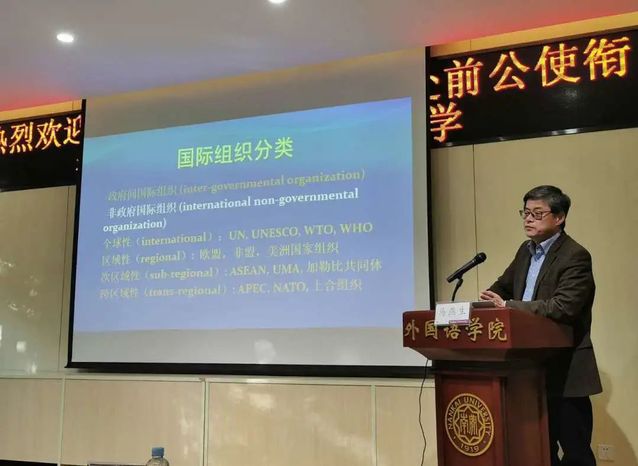 讲座中,马燕生首先介绍了国际组织和国际职员的分类和主要活动形式。他从地域分布和成员构成两个方面向同学们举例介绍国际组织的分类、特点,并以联合国为例讲解国际组织的一般结构及运行方式。在讲到国际组织内部的高层领导职类和专业人员职类时,马燕生提到除了相关专业领域外,国际组织还需要大量的管理类、翻译类、新闻、法律等多方面的专业人才,在选拔任用上有职级越高要求越高的特点。