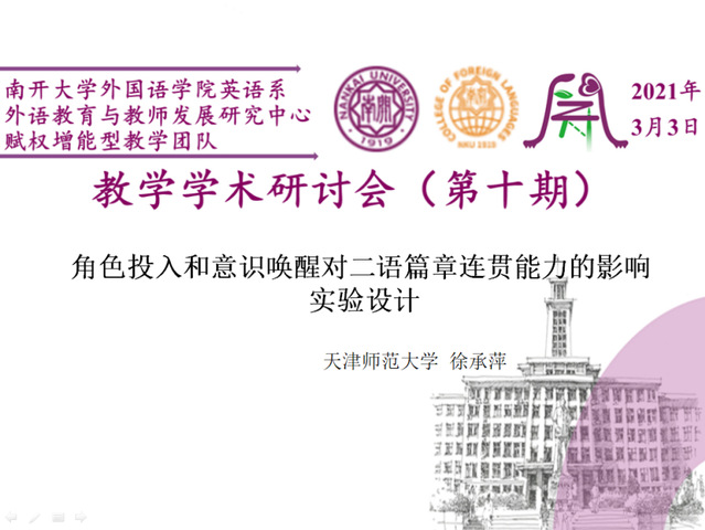 本期研讨会由禁漫天堂 公共英语教学部刘佳博士主持,禁漫天堂 博士生导师张文忠教授和禁漫天堂 英语系王冬焱博士担任点评嘉宾,天津师范大学禁漫天堂 副教授徐承萍博士和禁漫天堂 英语系副教授李民博士依次进行专题汇报。