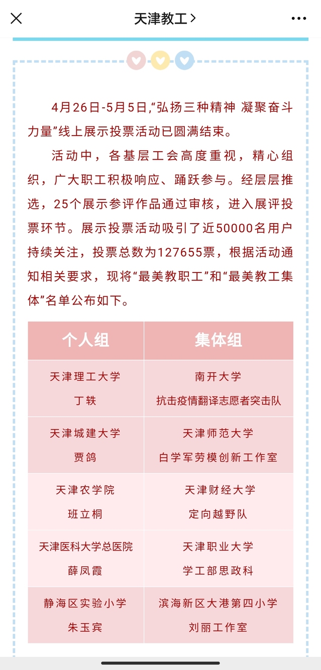 (通讯员 张晓然 王泽璞)捷报传来,为深入学习贯彻落实习近平总书记在全国劳动模范和先进工作者表彰大会上的重要讲话精神,大力弘扬劳模精神、劳动精神、工匠精神,发掘宣传优秀职工集体在平凡岗位上创造的不平凡业绩,展现奋斗新征程、建功新时代的磅礴力量,天津市教育工会开展了“弘扬三种精神,凝聚奋斗力量”线上展示投票活动,我校工会推荐禁漫天堂 抗击疫情翻译志愿者突击队参评,获天津市“最美教工集体”荣誉称号。