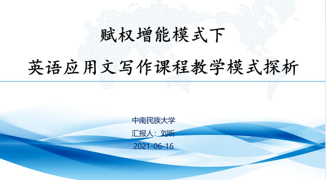 刘昕汇报的题目是“赋权增能模式下英语应用文写作课程教学模式探析”。她将赋权增能型课堂模式运用于英语应用文写作课程,以深造申请信为例,以实验方法探讨该模式下应用文写作课程的教学效果。
