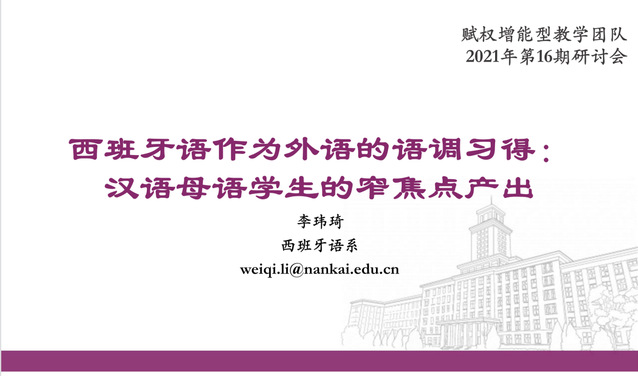 李玮琦以“西班牙语作为外语的语调习得:汉语母语学生的窄焦点产出”为题,从研究对象和目标、理论框架与实验设计、数据与结果、结果与讨论等方面分析汉语母语学生产出的西班牙语窄焦点句韵律的音系和语音特征,从中找出学生在习得中面临的困难。