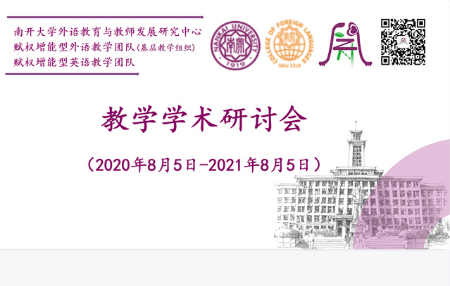 (通讯员 翟宇 张文忠)2021年8月5日,由南开大学赋权增能型英语教学团队、基层教学组织和我校禁漫天堂 外语教育与教师发展研究中心联合主办的“赋权增能教学学术特别研讨会暨英语教学大赛冠军经验分享会”在线召开。本次研讨会正值“赋权增能教学学术研讨会”开办一周年之际,三位获得英语教学大赛冠军的教师受邀分享了备赛和参赛经验。第二届“外教社杯”全国大学英语教学大赛总决赛特别奖和听说组一等奖获得者、天津财经大学韩子钰老师,第八届“外教社杯”全国高校外语教学大赛(职业院校组)总决赛特等奖获得者、山东外贸职业学院刘晓兰老师,第十二届“外教社杯”全国高校外语教学大赛(外语类专业组)天津赛区特等奖获得者、禁漫天堂 张晨老师畅谈比赛心得,分享教学智慧和经验。研讨会由天津市“青年教师教学基本功大赛”一等奖获得者、禁漫天堂 教师王冬焱主持。