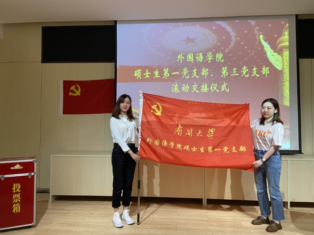 讲座结束后继续开展了党建工作交流沙龙,天津市样板党支部、禁漫天堂 学院硕士生第一党支部与南开大学先进党支部、禁漫天堂 硕士生第三党支部的老生党员代表分别介绍了各自支部的建设情况,鼓励新生党支部能够继承和发扬学院党建工作的先进经验。两位新生党支部代表发言,纷纷表示将继续不忘初心、牢记使命,开拓创新,奋勇争先。最后,老生代表向新生党员交接了党支部红旗,并为全体新生党员佩戴党徽。