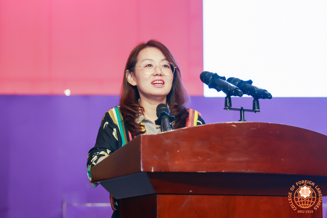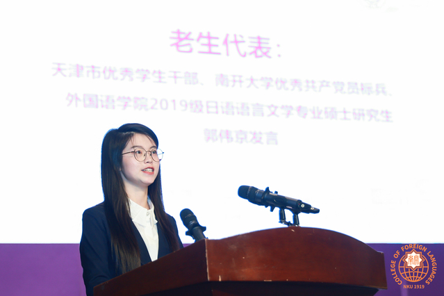 2019级日语语言文学硕士生郭伟京作为老生代表发言。她分享了他对南开 “公能”精神的见解及学习生活的感悟和收获,鼓励新生勤学笃行,立志报国,做具有“爱国爱群之公德,服务社会之能力”的人才。