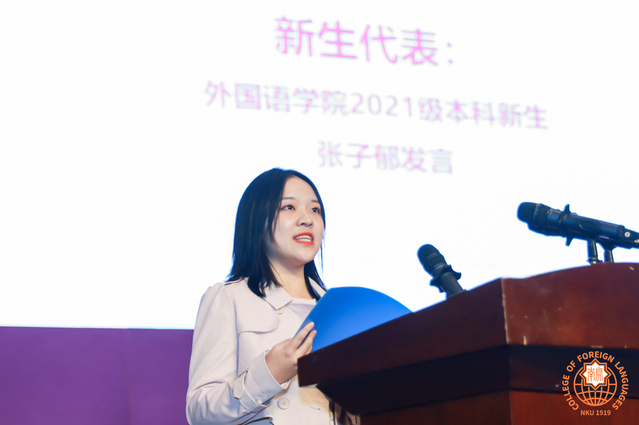 2021级日语专业本科生张子郁同学作为新生代表进行发言。她表达了她对南开禁漫天堂 的敬意和向往,表达了对父母师长、学校国家的感恩,并向自己及同学们提出三个问题:我们能为南开带来什么?能为家国社会带来什么?能为这个时代带来什么?最后她希望自己和同学们“知中国,服务中国”,奔赴心中的星辰大海。