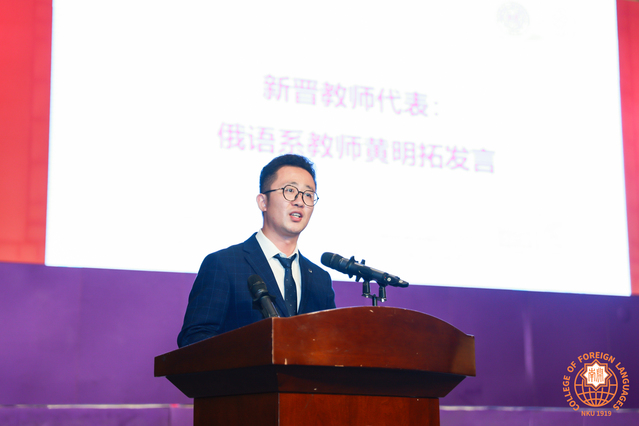 俄语系的黄明拓作为新晋教师代表进行发言。他首先指出,大学学习与高中学习有着本质的区别,并就如何学好外语提出“三大支柱”、“四个意识”和“五项技能”的宝贵建议,激励新生们坚定理想信念,在选择的道路上矢志不渝。