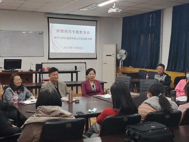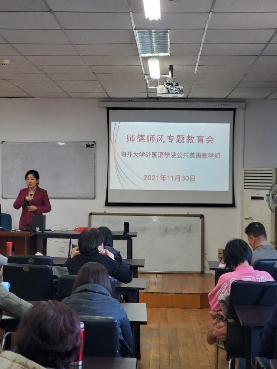 会上,李霞根据《南开大学关于开展师德专题教育的实施方案》,结合近期高校中出现的违反师德师风建设的具体案例,采用问答互动形式,再次解读、重温了《新时代高校教师职业行为十项准则》(即《师德承诺书》),强调了新时代广大教师立德树人的根本任务和培养德智体美劳全面发展的社会主义建设者和接班人的历史使命。李霞要求全体教师一定要以习近平新时代中国特色社会主义思想为指导,坚定政治方向、自觉爱国守法、端正言行,亲和友善、正直诚信,同时有意识地利用英语学科人文性的优势,加强课程思政建设,教学中传播优秀文化,教书育人,服务社会、奉献社会。