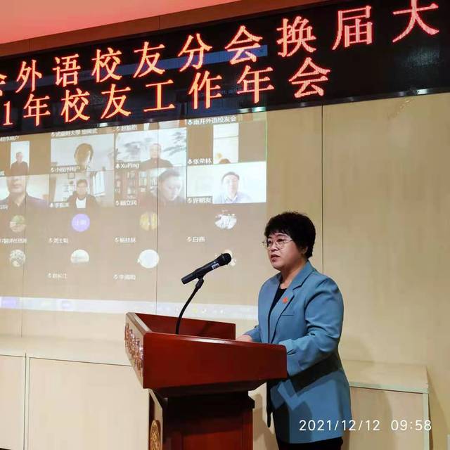 111报告厅欢声笑语,暖意洋洋。9时05分,庄严雄壮的《国歌》奏响。南开校友总会外语校友分会换届大会暨2021年工作年会线上线下召开。