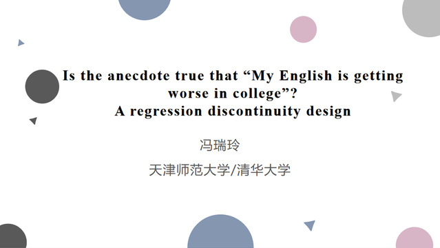 首先开场的是冯瑞玲博士,汇报题目为“大学英语真的越学越差吗?——基于断点回归设计的因果推断研究”。冯博士运用断点回归设计探索大学英语课程与学生英语水平的因果关系,为大学英语教学有效性研究提供了新思路。研究发现,外语学习的磨损速度和学习速度基本持平,产出技能磨损速度略快于输入技能。