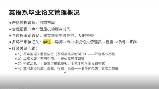 随后,各专业论文负责人就此次线上会议的内容、论文系统的使用方法及问题、论文工作时间节点的安排和目前管理工作中的实际情况逐专业进行了发言及讨论。我院2022届本科毕业论文工作涉及到8个语种、9个专业,297名学生以及93名指导教师,目前学生的毕业论文(设计)未受疫情影响,所有工作开展顺利。