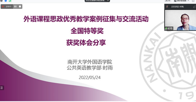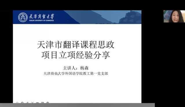 天津商业大学的杨森老师首先做主旨发言,题为“天津市翻译课程思政项目立项经验分享”。杨老师结合具体的课堂实例详细介绍了获得天津市立项,由天津商业大学禁漫天堂 院长王占斌教授担任主持人的该院笔译理论与实践(2)课程思政项目。该项目通过重新规划课程,加大了课堂翻译选段中思政相关主题的比重,采取翻译工作坊模式,强化课后辅导和第二课堂实践的作用,帮助学生拓宽文化视野,在双语转换过程中做到双文化并行,实现成功的跨文化交际。
