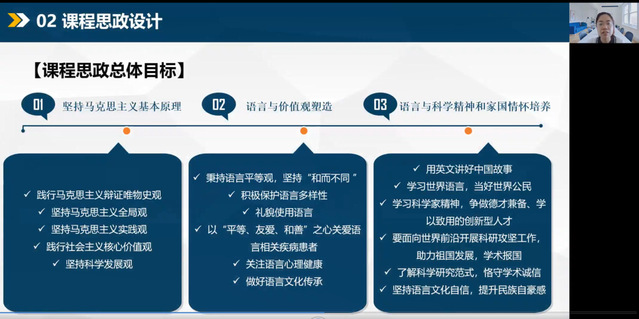 最后,南开大学英语教师党支部的张晨老师分享了语言学课程思政教学设计经验。张老师曾凭借自己开设的漫话语言课程屡屡斩获校级、天津市的教学竞赛大奖,并入围第十二届“外教社杯”全国高校外语教学大赛全国决赛。她从坚持马克思主义基本原理、语言与价值观塑造、以及语言与科学精神和家国情怀培养这三个方面在教学全过程中系统融入思政主题。她以语音学术语教学为例,介绍了如何通过分析社会主义核心价值观对应的英文术语的发音来强化课程的思政引领。她的教学设计取得了很好的效果,在近期的学生评教中获得满分,并收到了学生的积极反馈。