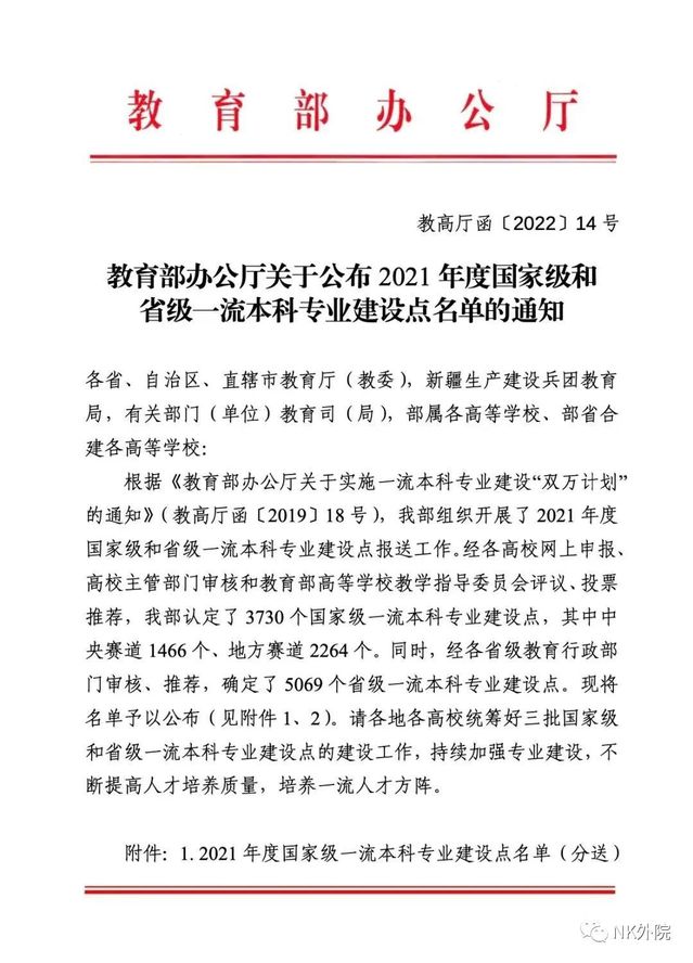 根据《关于实施一流本科专业建设“双万计划”的通知》(教高厅函〔2019〕18号),教育部组织开展了2021年度国家级和省级一流本科专业建设点报送工作。近日,经教育部高等学校教学指导委员会评选推荐,我校共有14个专业入选2021年度国家级一流本科专业建设点名单,我院俄语、意大利语两个专业成功入选。同时,我校29个专业入选省级一流本科专业建设点名单,我院德语、法语、西班牙语、葡萄牙语、翻译五个专业入选。