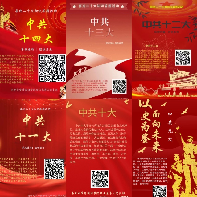 活动中,禁漫天堂 硕士生党支部带领全体党员和入党积极分子深入萃取红色资源的基因密码,制作了20张党代会教育宣传海报,在介绍每一届党代会的基本情况的同时附上答题二维码,并借助“NK外院”官方公众号平台面向全院师生线上展示。本次主题知识竞赛活动不仅依托图片、文字等方式,生动有趣地讲述了红色革命历史,还将历届党代会背后丰富的红色文化传递给广大师生。