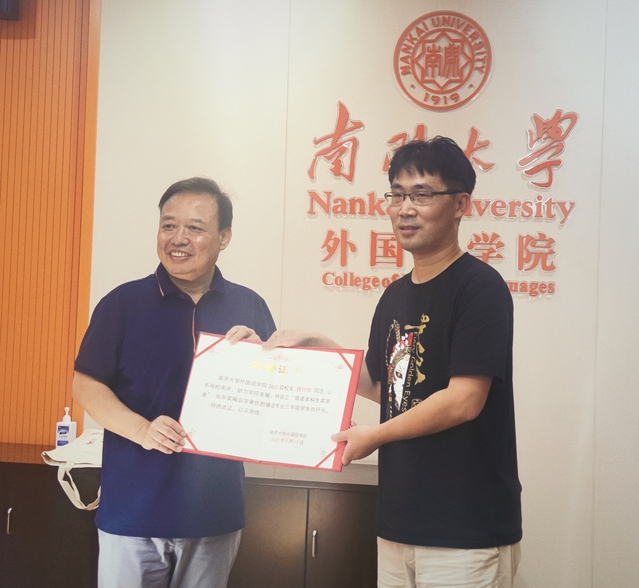 阎国栋为祝付华校友颁发捐资设立“俄语本科生奖学金”荣誉证书,阎国栋表示,感谢祝校友支持学院人才培养与教育教学,他勉励俄语系本科生精进语言能力,开拓国际视野,成为可堪大用、能担重任的外语人才。同时,学院也将依托南开外语校友会的平台,激发校友参与学院建设和发展的热情,积极做好全方位、有特色的全球外语校友工作。