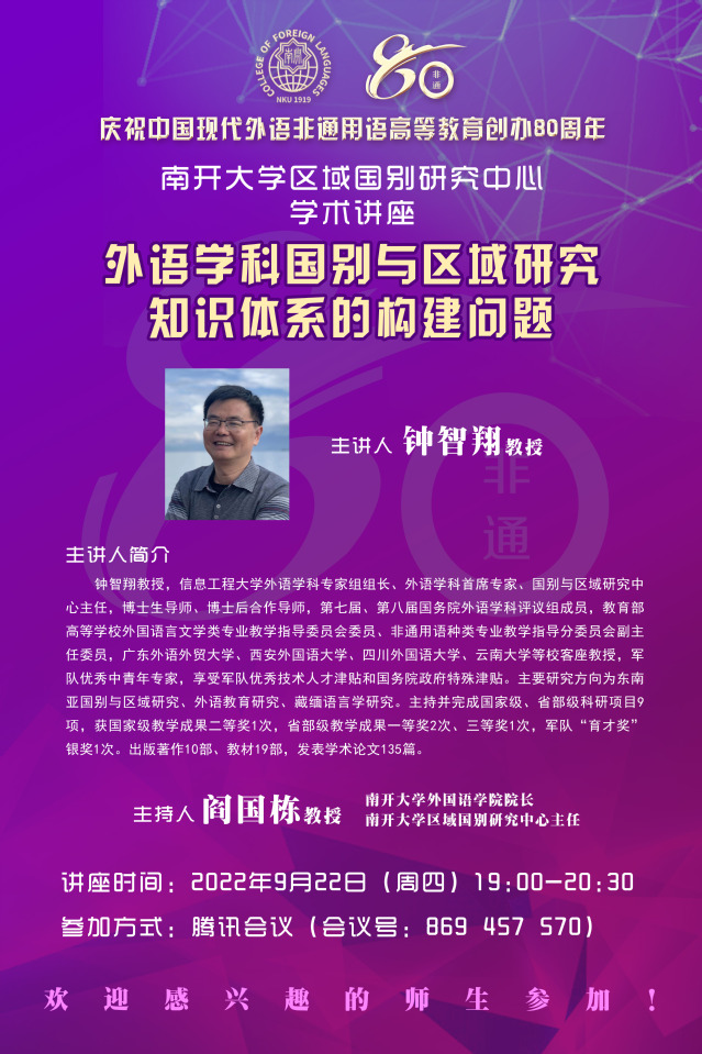 (通讯员 吴诗敏 康姝杭 杨琳)2022年9月22日晚,钟智翔教授为南开大学区域国别研究中心带来题为“外语学科国别与区域研究知识体系的构建问题”的学术讲座。钟智翔教授是信息工程大学外语学科专家组组长、外语学科首席专家、国别与区域研究中心主任,博士生导师、博士后合作导师,第七届、第八届国务院外语学科评议组成员,教育部高等学校外国语言文学类专业教学指导委员会委员、非通用语种类专业教学指导分委员会副主任委员。讲座以线上形式举行,校内外师生共百余人参加。此次讲座是“庆祝中国现代外语非通用语高等教育创办80周年”的学术活动之一。