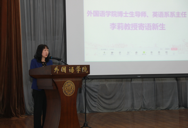 英语系主任、博士生导师李莉教授作为教师代表讲话。李莉教授用“从语言学习出发,学以致用走向实践”作为主题,旁征博引,希望同学们将语言作为了解世界的窗口和走向世界的舞台,劝勉新生勤于思考、潜心读书、勇于担当民族复兴大任、心怀爱国主义伟大理想,成为高尚质朴、学术精良的新时代南开人,奋进新征程,谱写新篇章。