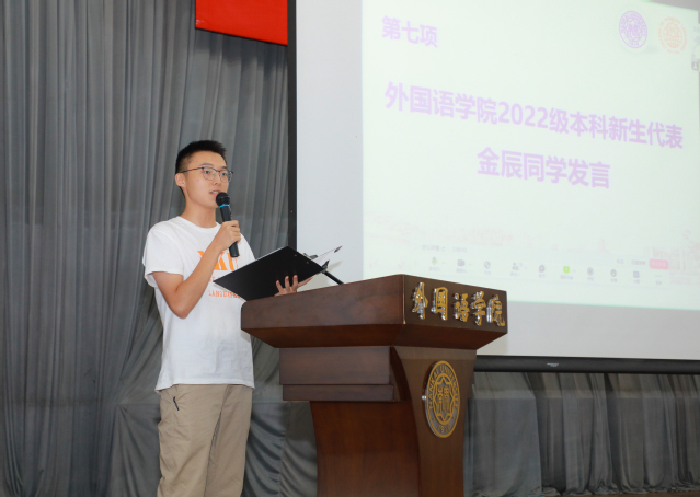 2022级法语系本科新生金辰作为新生代表发言,他以“立”作为自己大学生活的关键字,勉励自己独立生活、继往开来以立身,树立信仰、明确所向以立心,矢志报国、知行合一以立行,号召同学们成人并成才、自立以立国,在“知中国服务中国,爱中华复兴中华”的征程中践行“允公允能,日新月异”的南开精神,鲜衣怒马少年时,不负韶华行且知。