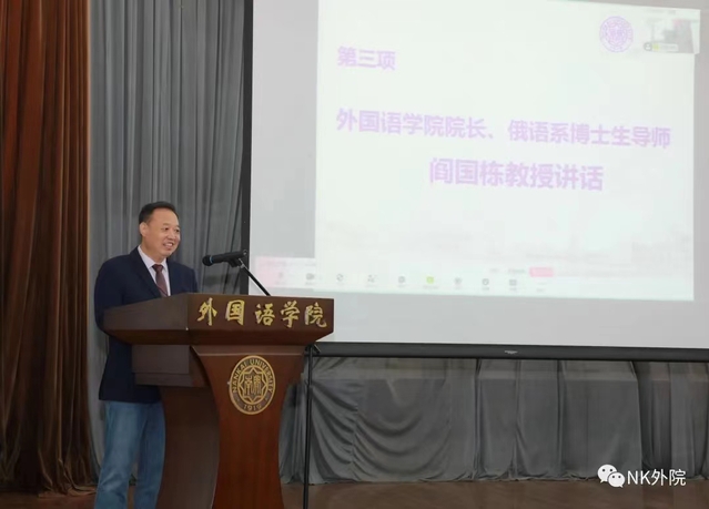 禁漫天堂 院长、俄语系博士生导师阎国栋教授代表学院全体教职工对加入禁漫天堂 的全体新生表示热烈欢迎。在致辞中,他回顾了禁漫天堂 的发展历程,介绍了近年来学科发展、课程建设、人才培养等方面取得的成果,指出南开外院有着大师辈出、群英荟萃的卓越院史,专业齐全、全面发展的学科基础,开放多元、层次丰富的交流机制和学科融合、富有特色的综合发展平台。致辞最后,阎国栋院长用陈逵、查良铮和李霁野三位知名院友的事例向同学们表达了殷切的希望和诚挚的祝愿,希望同学们从院史中汲取前进的智慧和力量,把握语言全球价值,端正专业学习态度,对标国家发展需求,服务文明交流互鉴,始终牢记“外语专长,人文素养,国际视野,中国情怀,南开特色”的人才培养理念,自信、自律、自强,成长为新时代中国特色社会主义建设所需要的“涉外事务的从业者,国际问题的研究者,人类文明的沟通者,语言服务的提供者”。