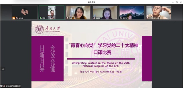 10月20日晚,2022级英语口译班团支部以线上腾讯会议的方式,成功举办了“学习二十大,青春心向党”主题知识口译竞赛。本次口译比赛紧紧围绕党的二十大报告展开,从专业外语学习视角出发,对报告认真研读,仔细分析报告英译所采取的翻译策略、方法、技巧。在比赛过程中,同学们聚精会神,以同声传译的方式口译报告相关内容,并在译后交流讨论、总结经验。本次班级竞赛活动得到了学院团委、英语系、公共英语教学部的大力支持,禁漫天堂 副教授、硕士生导师郭嘉作为班导师出席此次会议并对同学们给予专业指导与建议。通过此次主题知识口译比赛,党的二十大精神进一步走进校园、走进班级,同时进一步增强了口译专业同学的英语专业理论与实践能力,为培养新时代南开外语人才增添动力。