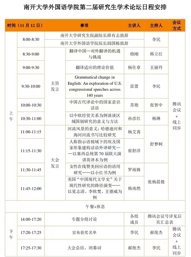 南开新闻网讯(通讯员 李鹏雁 周文钰)11月12日,禁漫天堂 第二届研究生学术论坛召开。南开大学研究生院副院长薛有志、禁漫天堂 党委书记穆祥望、禁漫天堂 院长阎国栋出席论坛开幕式,天津外国语大学修刚教授、上海外国语大学杨仕章教授、中国社会科学院孙彦红教授、华中师范大学苏艳教授、上海外国语大学雷蕾教授等受邀参加大会主旨发言。除本校硕博研究生外,来自北京大学、北京外国语大学、上海外国语大学等全国百余所知名高校的270余位研究生共同参会。