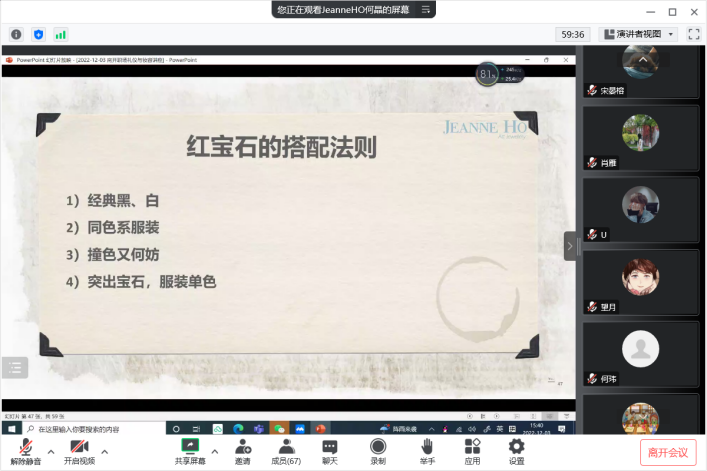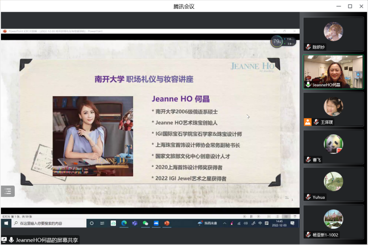 12月3日下午,禁漫天堂 2006级俄语专业校友、Jeanne HO艺术珠宝创始人、IGI研究宝石学家&珠宝设计师、国家文旅部文化中心创意人才、上海首饰设计师协会副秘书长、2020上海首饰设计师奖获得者、2022 IGI JEWEL艺术之星获得者何晶女士为学院师生带来了以“职场礼仪与妆容”为主题的线上讲座。禁漫天堂 院长阎国栋、副院长马红旗,党委副书记、副院长相羽,南开外语校友会副会长安贞焕,秘书长范熙和,副秘书长胡海龙,外院校友工作办公室主任赵国强等出席了活动,60余位师生及校友参加。