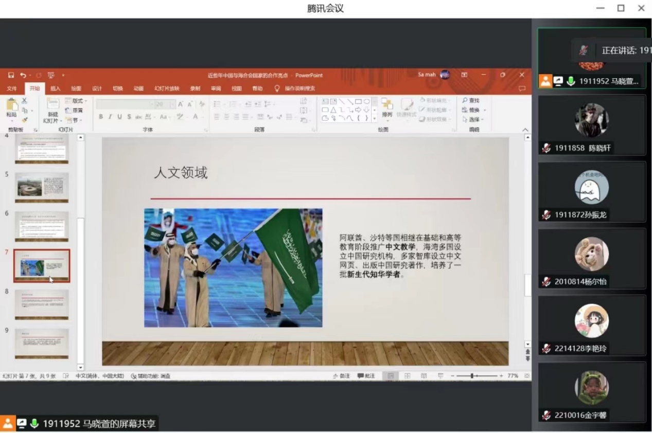 首先19级阿语专业班马晓萱同学进行知识分享,从基础设施建设、医疗卫生、人文、数字经济以及其他等领域,介绍了近些年来中国同海合会国家之间的一些合作亮点。