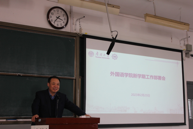 接着,院长阎国栋代表院班子进行述职、院班子其他成员分别就分管工作进行了述职。同时,阎国栋从教育教学、人才人事、学科建设、科学研究、国际交流等方面,专题部署了2023年学院重点工作任务。阎国栋强调,全院师生要齐心协力、踏实作为,推进学院各项工作任务的高质量完成。阎国栋要求,全院师生要始终坚持立德树人根本任务,以学科建设和人才培养内涵式高质量发展为主线,进一步优化体制机制,坚持问题导向,紧抓后疫情时期的突出矛盾,深入破解制约高层次人才建设、招培就一体化建设、科研高质量发展等方面的难题,努力实现师生党支部联动建设、引进和培育高层次人才、系列教材和“课程思政”教材出版、省部级教育教学奖项、招生质量提升、科研质量提升和学位点建设等方面的建设目标;进一步推动公共英语教学部和学院的有机融合,充分发挥多语种学科优势,服务全校的国际化人才培养。