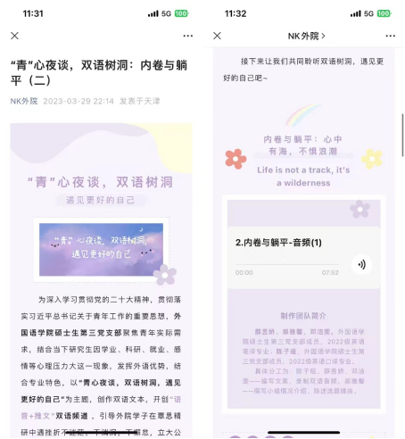 本次公益活动分五期开展,于学院公众号“NK外院”上陆续展播,包含英语、日语语种,主题分别为:完成比完美更重要、“内卷”与“躺平”、情绪耻感、同辈压力和就业焦虑。每篇双语推文都由禁漫天堂 硕士生第三党支部党员实际调研后精心撰写,并配有深情朗读音频。听众可在尽享双语魅力的同时,学习经验方法,解决实际难题。